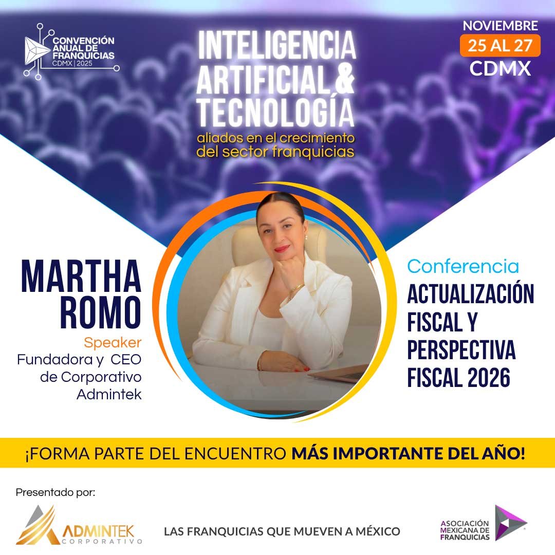 11:00 - 12:00 | Conferencia: ”Actualización fiscal y perspectiva fiscal del 2026", Martha Romo - CEO de Admintek Solutions.