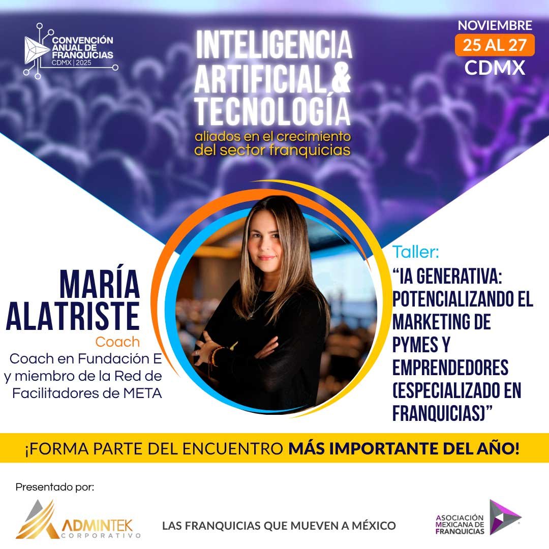 16:00 - 17:00 | Taller “IA Generativa: Potencializando el Marketing de Pymes y Emprendedores (Especializado en Franquicias)”, María Alatriste – Coach en Fundación y miembro de la Red de Facilitadores de META.