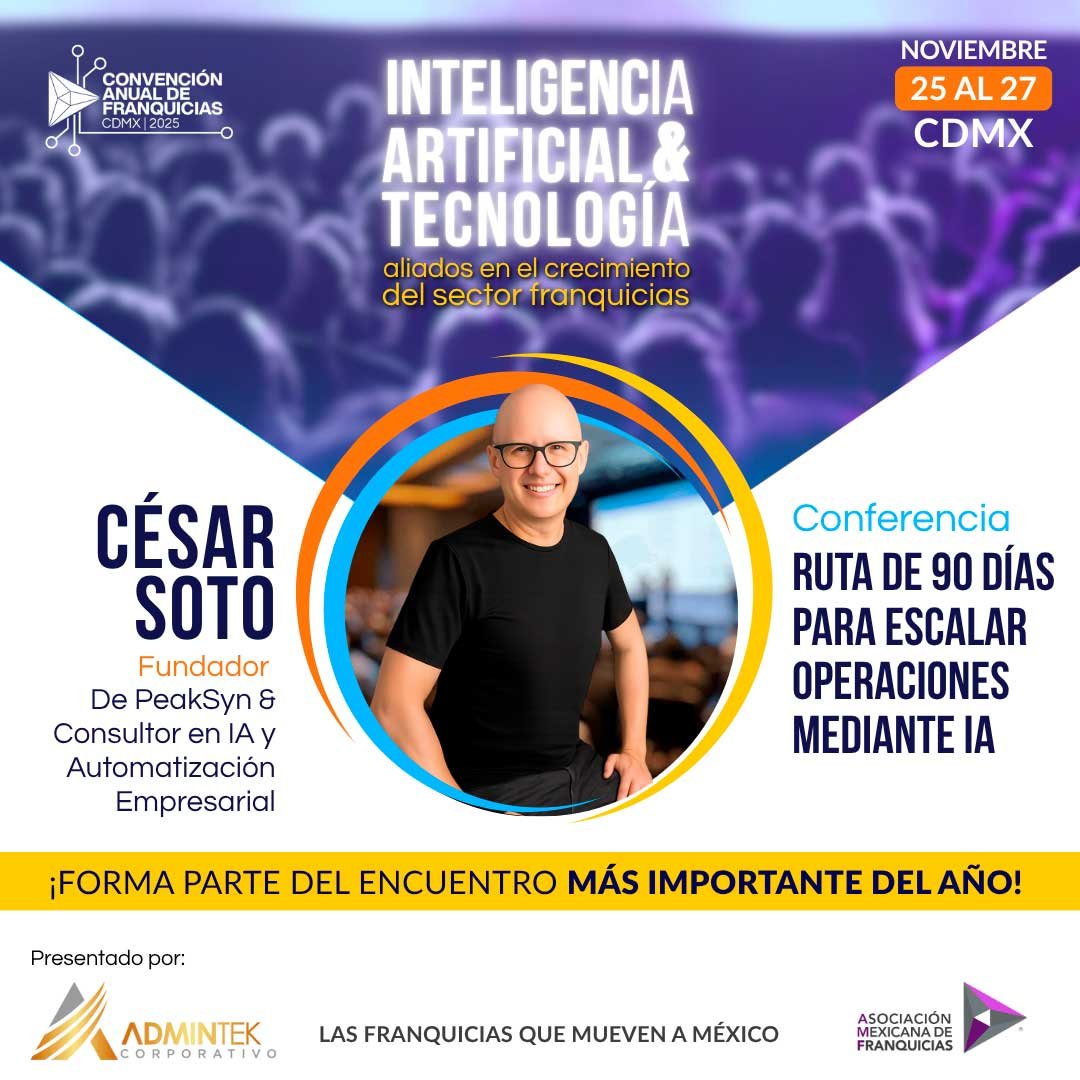 09:30 - 10:30 | Conferencia: “Ruta de 90 días para escalar operaciones mediante IA”, César Soto – Fundador de PeakSyn y Consultor en IA.